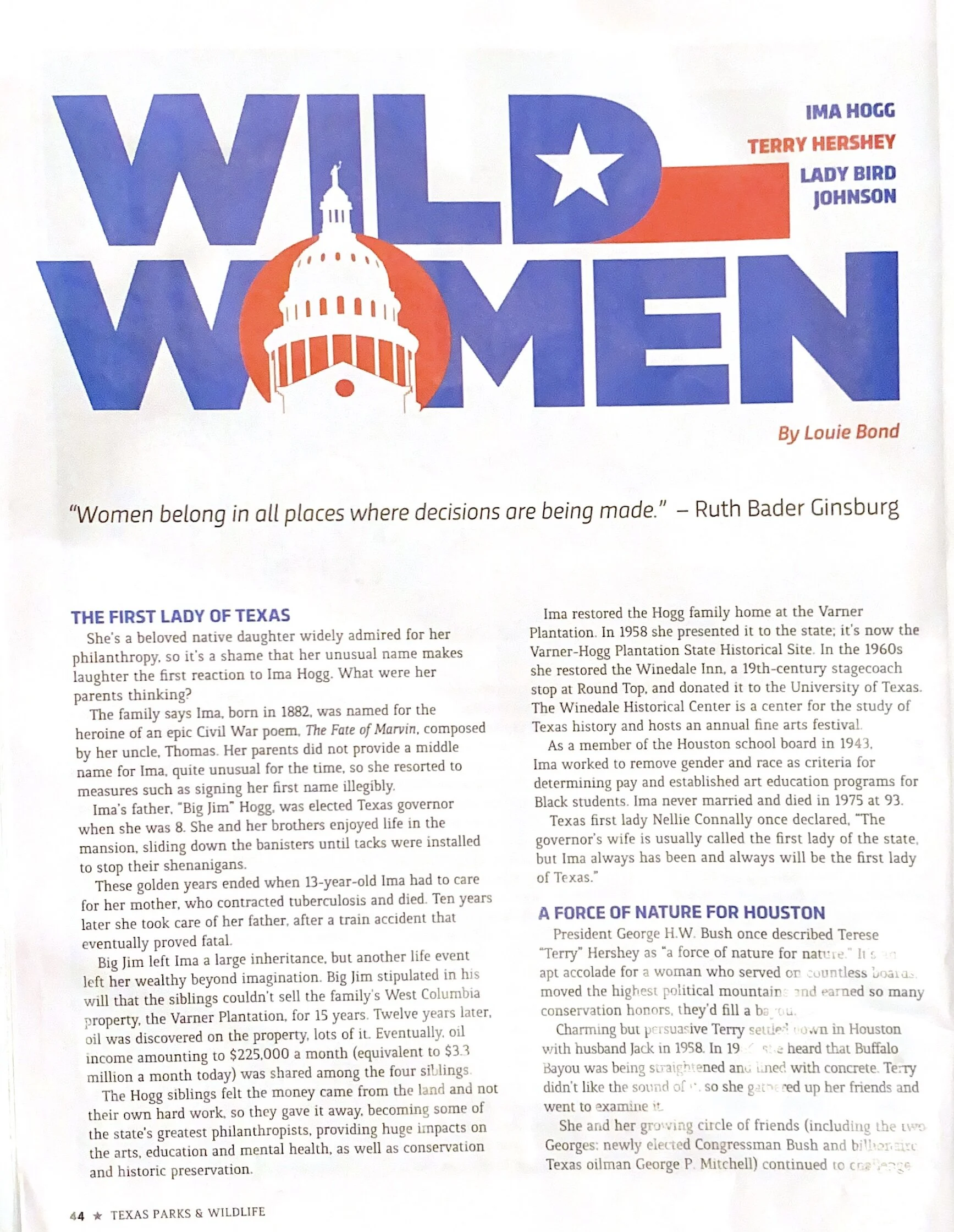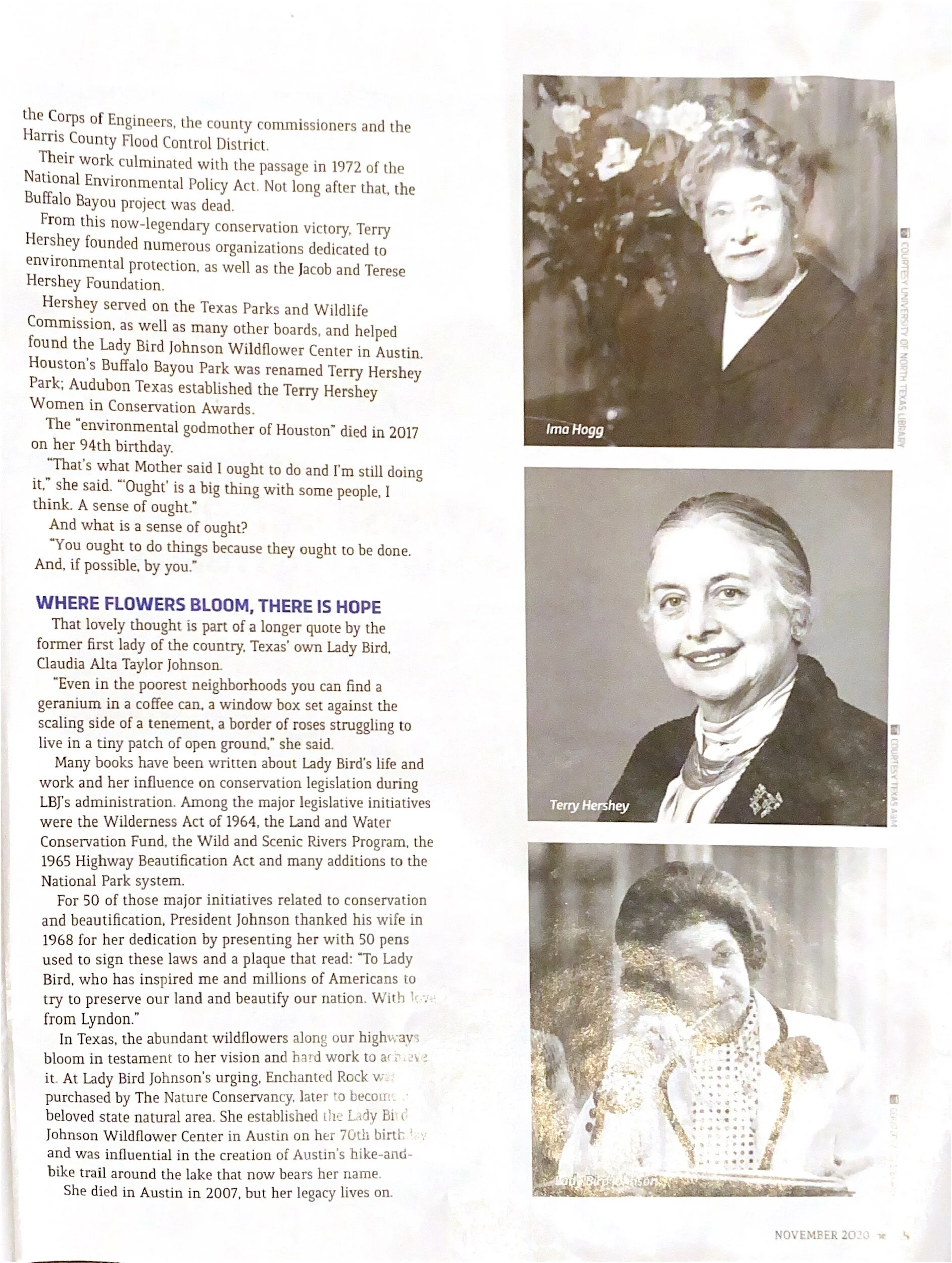 Curtis reads everything. When he finds articles, I will enjoy heaves them for me on the kitchen counter, where I have my morning coffee. This article is from Texas Parks and Wildlife. I had coffee with these Ina Hogg, Terry Hershey, and Ladybird. I am in awe.