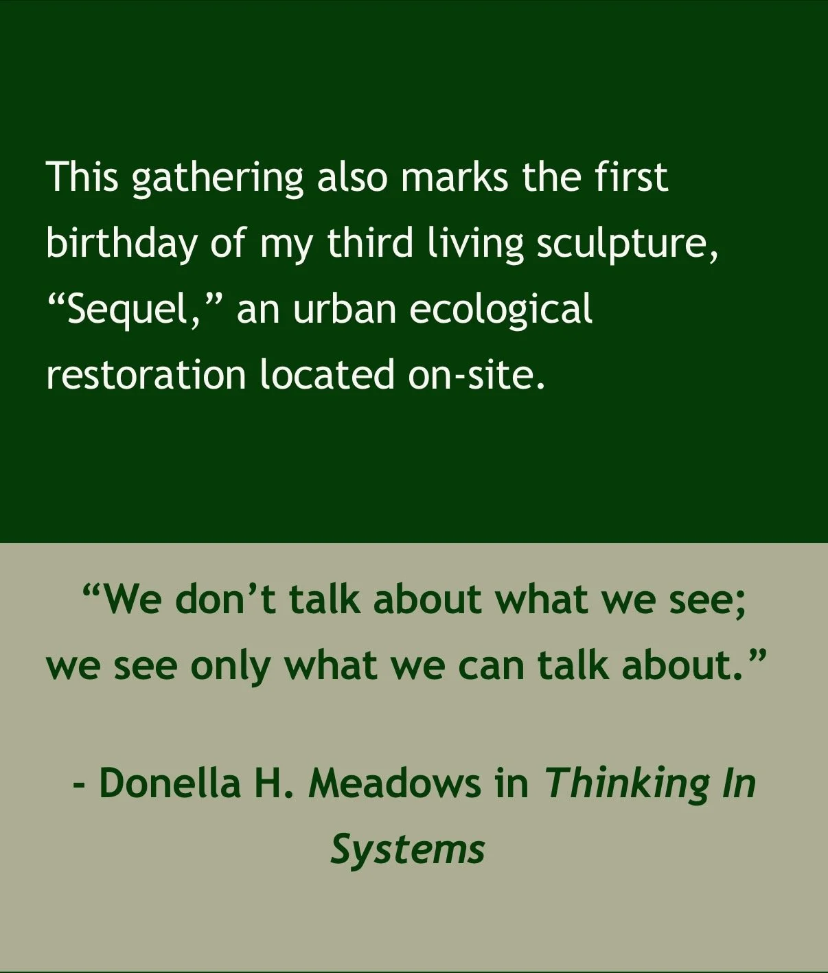 Integrating systems theory into my art practice has influenced my work in many ways. It is one of my core beliefs that in order to save the planet it is imperative that every organization, be it large profit-driven or small non-profit, commits to embedding an environmental ethos into their core values. The place to start is with an organizations mission statement.