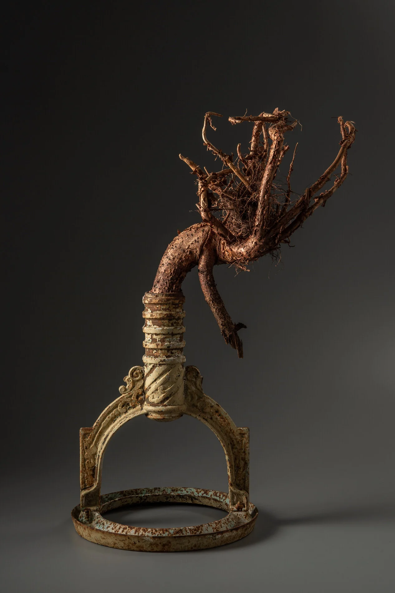 Repurposing two tools from agronomy, Root to Water shifts how we see mechanical systems versus naturally occurring systems. In this sculpture, a modern innovation—a rusting, decorative, human-made irrigation wheel—serves as a pedestal for an organic found object that often goes unseen: a root system. With this pairing, I exhibit man’s historical struggle to transition to an agricultural-based society utilizing human-made innovations that extract natural resources instead of harnessing existing ecological systems that regenerate resources.