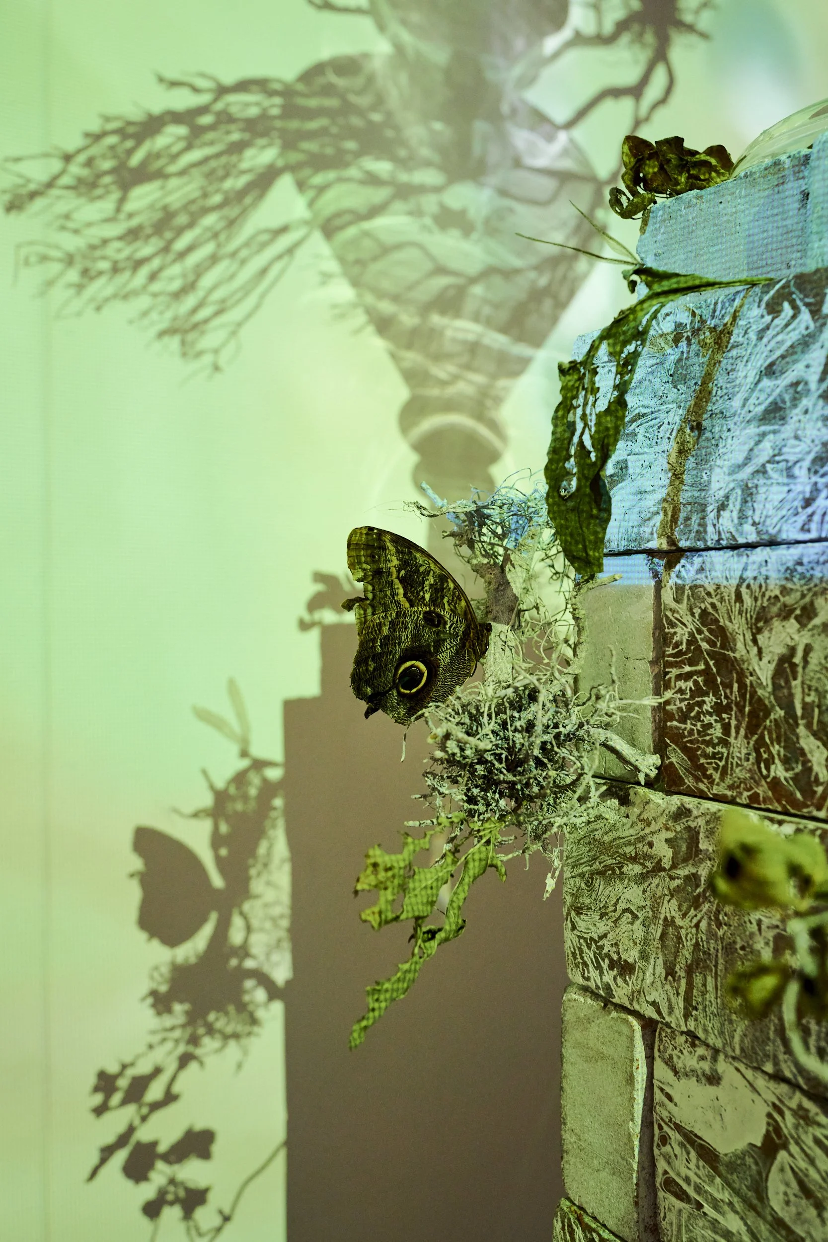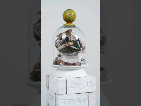 As a symbolic gesture before the discussions began, each person added an element to provide the future with a water system to sustain life on Earth. The objects in the documentation are found objects — a glass jar and cork lid, shale, charcoal, mesh, distilled water, springtails to eat the fungus, and a Monarch carcass to envision the future. Sourced from Symbiosis, the piece includes living soil, Horseherb (Calyptocarpus vialis), Bigfoot Waterclover Marsilea macropoda, two chrysalides, two oyster shells, decaying plant matter and a bird skeleton.